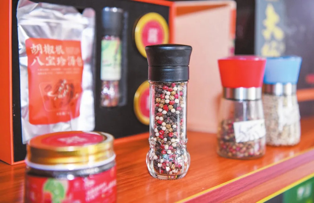 在“印象大坡”直營(yíng)店展示的胡椒系列產(chǎn)品。??谌?qǐng)?bào)記者 蘇弼坤 攝