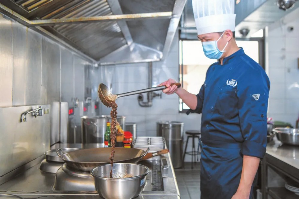 在金盤(pán)食驗(yàn)室的后廚,工作人員正在加工胡椒益智辣椒醬。??谌?qǐng)?bào)記者 蘇弼坤 攝