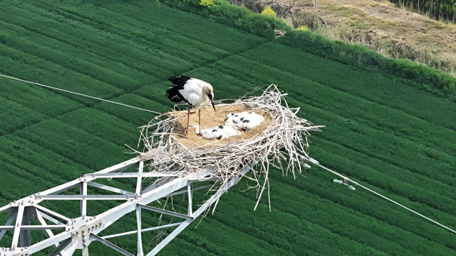 在濱淮農(nóng)場養(yǎng)殖中心旁的兩座電力鐵塔上,由枯枝搭建的巨型鳥巢格外醒目。被譽為“鳥界大熊貓”的國家一級重點保護(hù)野生動物東方白鸛,已連續(xù)多年在此筑巢繁衍,今年更是有兩窩共8只幼鳥破殼而出,正健康成長,成為春日濱淮農(nóng)場一道靈動的生態(tài)風(fēng)景線。