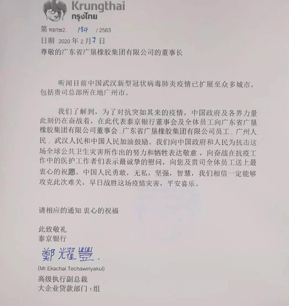 泰京銀行致函廣墾橡膠集團(tuán),慰問公司員工,共為中國加油。
