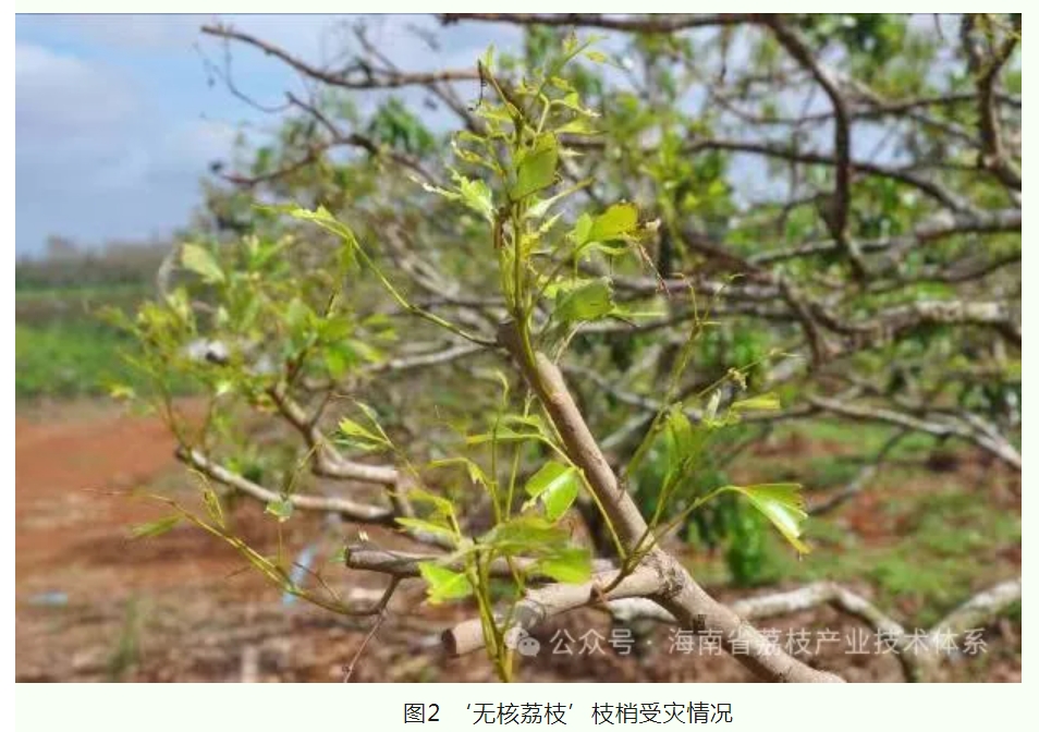 荔枝枝梢生長期正值海南的雨季,臺風(fēng)活動頻繁。荔枝營養(yǎng)生長期遭遇強風(fēng)暴雨易造成葉片破損、樹枝折斷,甚至整株倒伏,對荔枝來年的產(chǎn)量形成造成嚴(yán)重影響,為有效應(yīng)對臺風(fēng)災(zāi)害對荔枝生產(chǎn)造成的不利影響,提出如下建議: