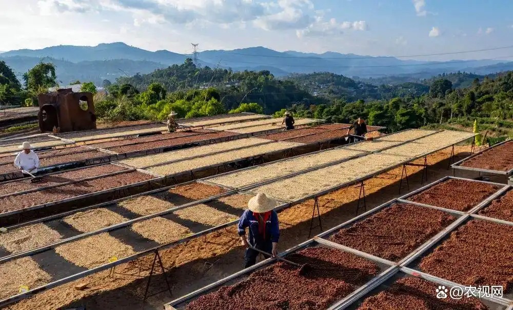2025年1月7日,工人在普洱市思茅區(qū)一家咖啡莊園翻曬咖啡(無人機照片)。圖源:新華社