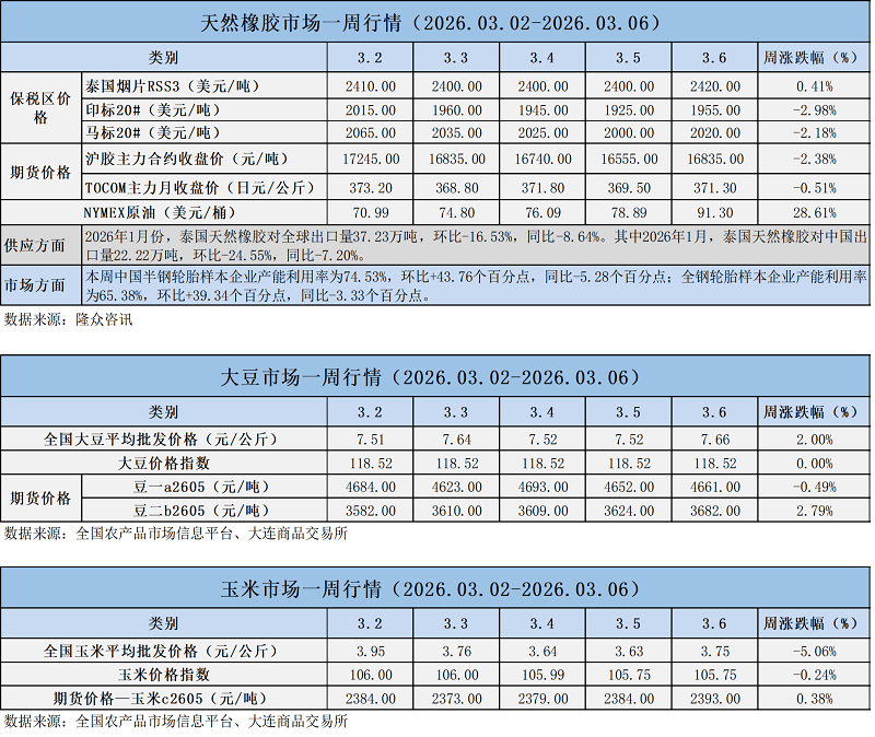 天然橡膠、大豆、玉米市場(chǎng)一周行情(2026.03.02-03.06)