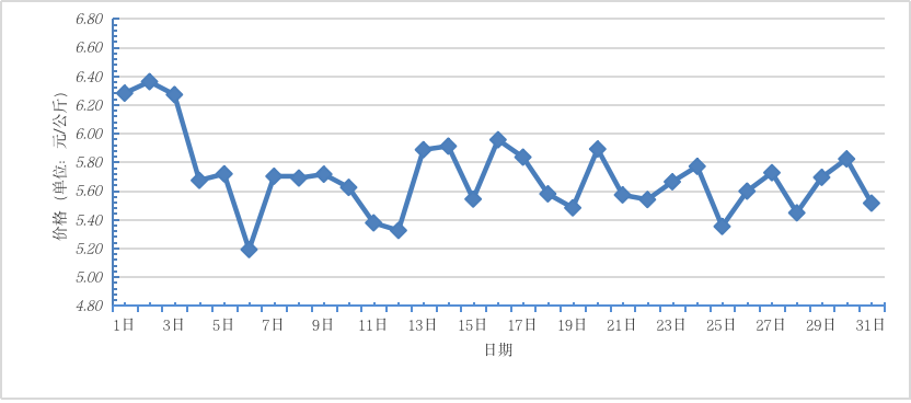 8月,全國重點監(jiān)測農(nóng)產(chǎn)品批發(fā)市場香蕉總交易量達 4.6萬噸,同比下降46.5%,環(huán)比上漲130%;總交易價值 29332.1萬元,同比下降30%,環(huán)比上漲129.5%。日平均價格最高為6.4元/千克,最低為5.2元/千克,全月平均價格為 5.7元/千克,同比上漲14.0%,環(huán)比上漲3.6%(每日價格變化如圖)。