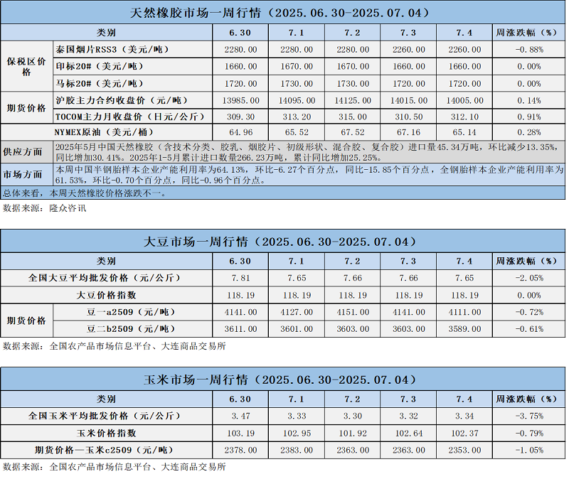 天然橡膠、大豆、玉米市場一周行情(2025.06.30-07.04)