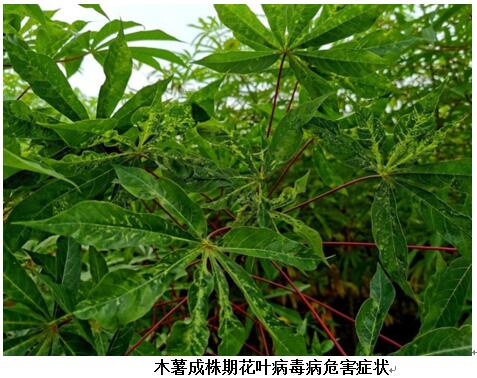 危害癥狀:感病葉片初為褪綠斑點,逐漸擴大,整片葉呈花葉狀;嚴重時葉片變小,背面有時可見突起,葉片中部和基部常收縮成蕨葉狀,受侵染葉片癥狀嚴重程度隨季節(jié)、栽培品種不同而異。在涼爽的雨季,病害癥狀表現(xiàn)最嚴重,夏季常隱癥或淺花葉。煙粉虱是田間傳播的主要介體。