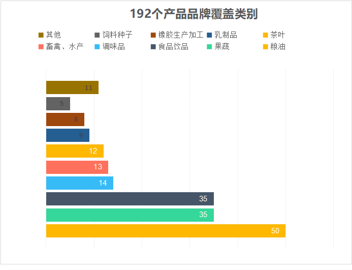《中國(guó)農(nóng)墾品牌目錄》中,僅192個(gè)產(chǎn)品品牌其涵蓋范圍就包括糧油、果蔬、食品飲料、茶葉、乳業(yè)等多個(gè)領(lǐng)域,其中糧油類(lèi)50個(gè)、果蔬類(lèi)35個(gè)、食品飲料35個(gè),占所有收錄類(lèi)別63%。與《中國(guó)農(nóng)業(yè)品牌目錄2019農(nóng)產(chǎn)品區(qū)域公用品牌》300個(gè)、11個(gè)門(mén)類(lèi)相比,農(nóng)墾品牌全品類(lèi)特征明顯。